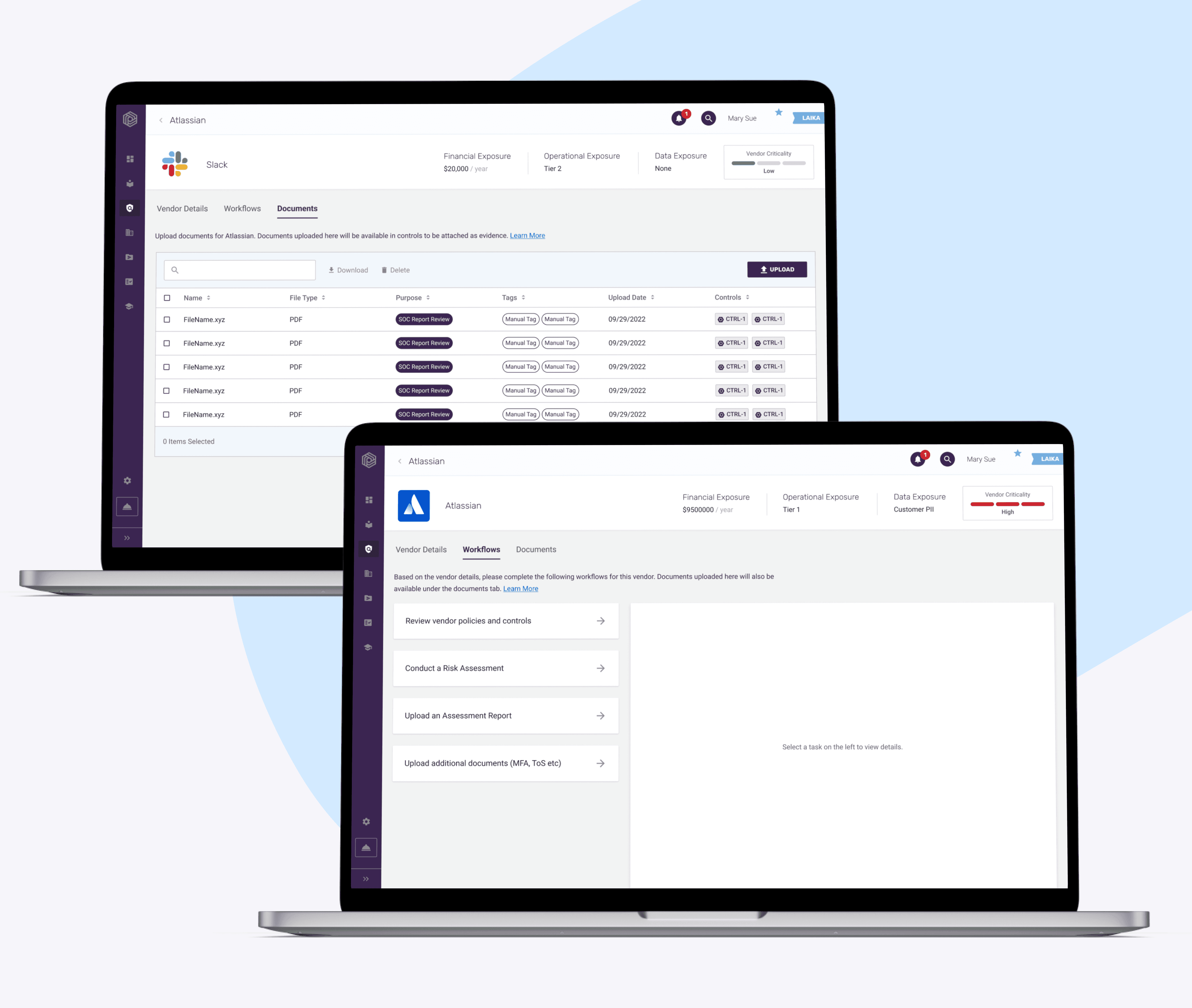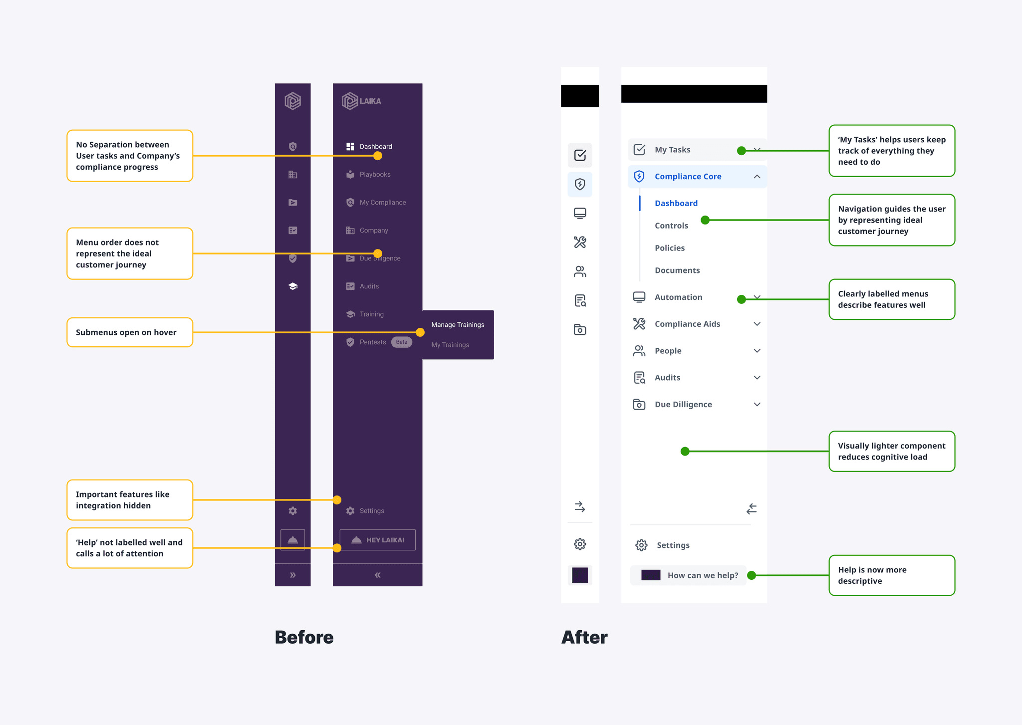 Laika helps startups build and automate info-sec compliance programs. I was the lead designer on the global nav redesign initiative to improve in-app navigation.